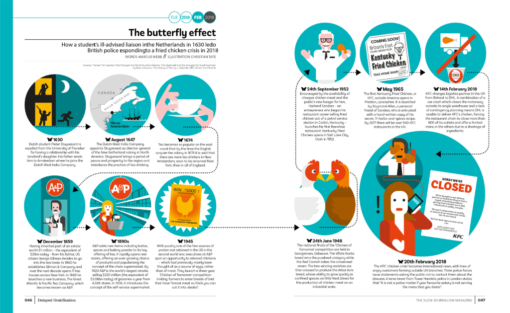 The Slow Journalism Company produces, among other things, a quarterly magazine called Delayed Gratification. It’s a very well researched and designed news retrospective that covers global events three months after they happen. With its focus on the facts and looking at the bigger picture there are lots of infographics within each issue. Alongside the more serious articles are entertaining and fun pieces about general trivia.