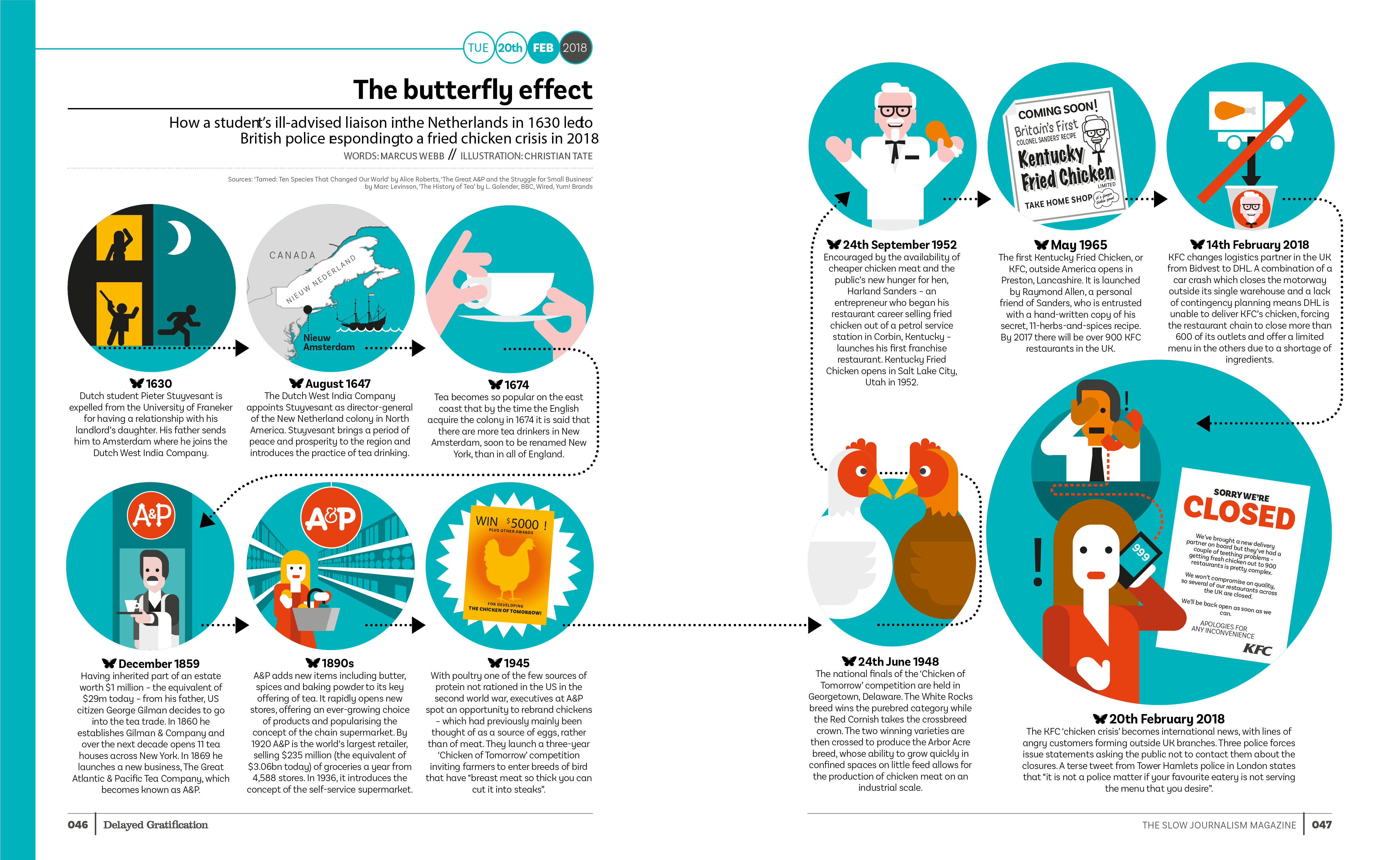 One such regular piece is their butterfly effect infographic, where they track current events all the way back to a surprising and often hilarious origin, tying it in with numerous historical events along the way.