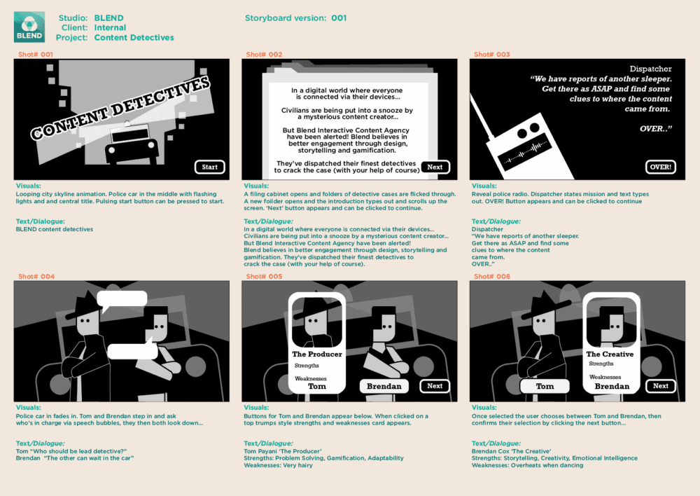 With Blends background in animation we’re well versed in storyboarding. This is where we take the journey laid out in the script and visualise all the key moments and beats. This takes the form of thumbnail sketches that bridge the gap between a text-based script and a fully realised design. Storyboards are perfect for testing out the user journey and aligning stakeholders on the direction of a project.